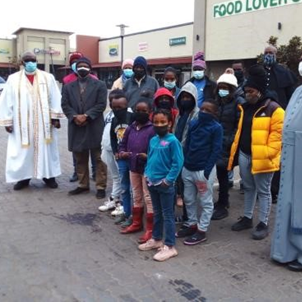Bishop Mogwera (far left) and Father Molefe(far right) prating at Diepkloof Square after the July 2021 looting.